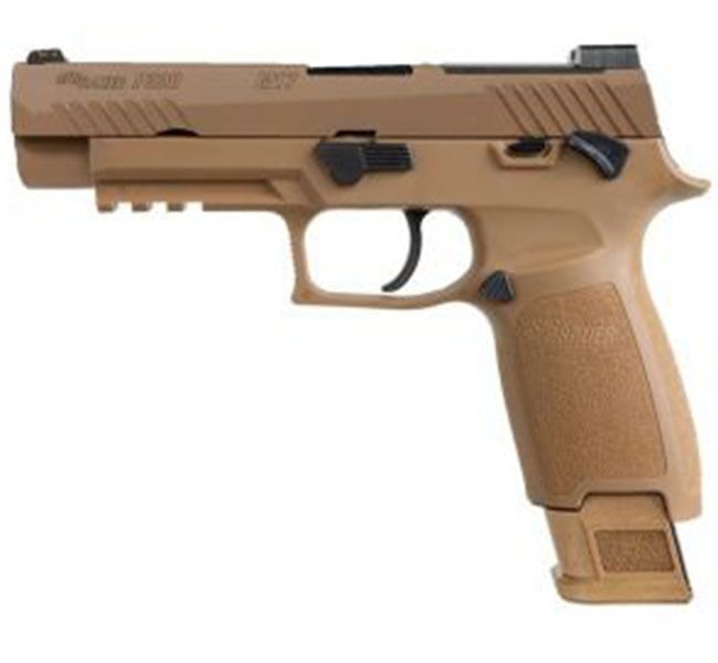 The P320-M17 is a 9mm, striker-fired pistol and comes with one (1) 17-round magazine and two (2) 21-round magazines. The pistol features a coyote-tan PVD coated stainless steel slide with the same optic cut as specified by the MHS contract, and black controls just like the pistols currently being shipped to the U.S. Army; it comes equipped with a SIGLITE front night sight and removable Night Sight rear plate. The P320-M17 features a coyote-tan carry-length grip module, available in three sizes, and comes standard with a manual safety. Non-Manual-safety models are also available (320F-9-M17).